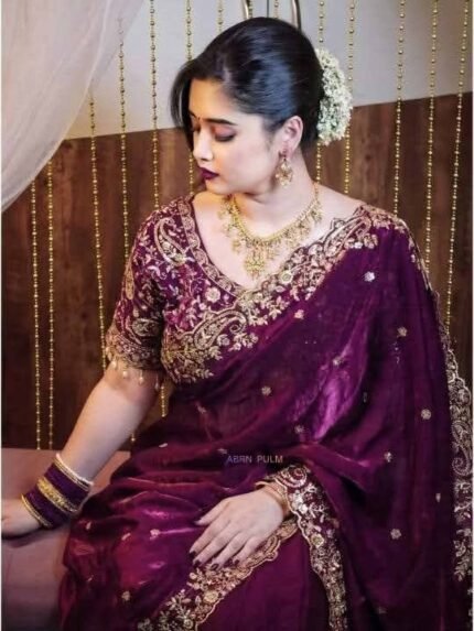 রয়্যাল জিম্মি চু ভেলভেট শাড়ি – জাম কালার